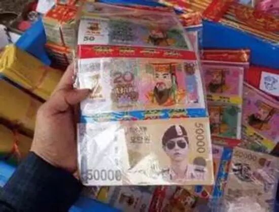 “宋仲基冥币”是韩国男演员宋仲基在韩剧《太阳的后裔》中的剧照被印在冥币上,冥纸上选用宋仲基在《太阳的后裔》里穿着迷彩服、戴着墨镜的剧照。